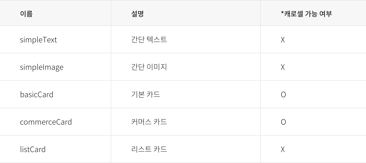 서버에서 사용자에게 값을 되돌려 주는 것은 SkillResponse 이다. 크게 version/template/context/data 4가지 부분으로 구성된다. 내가 중요하다고 생각되는 부분은 "template" 부분이다. 이 부분은 사용자가 실제로 볼 부분이다. 나머지 설명은 오픈빌더 도움말에 잘 나와있다.