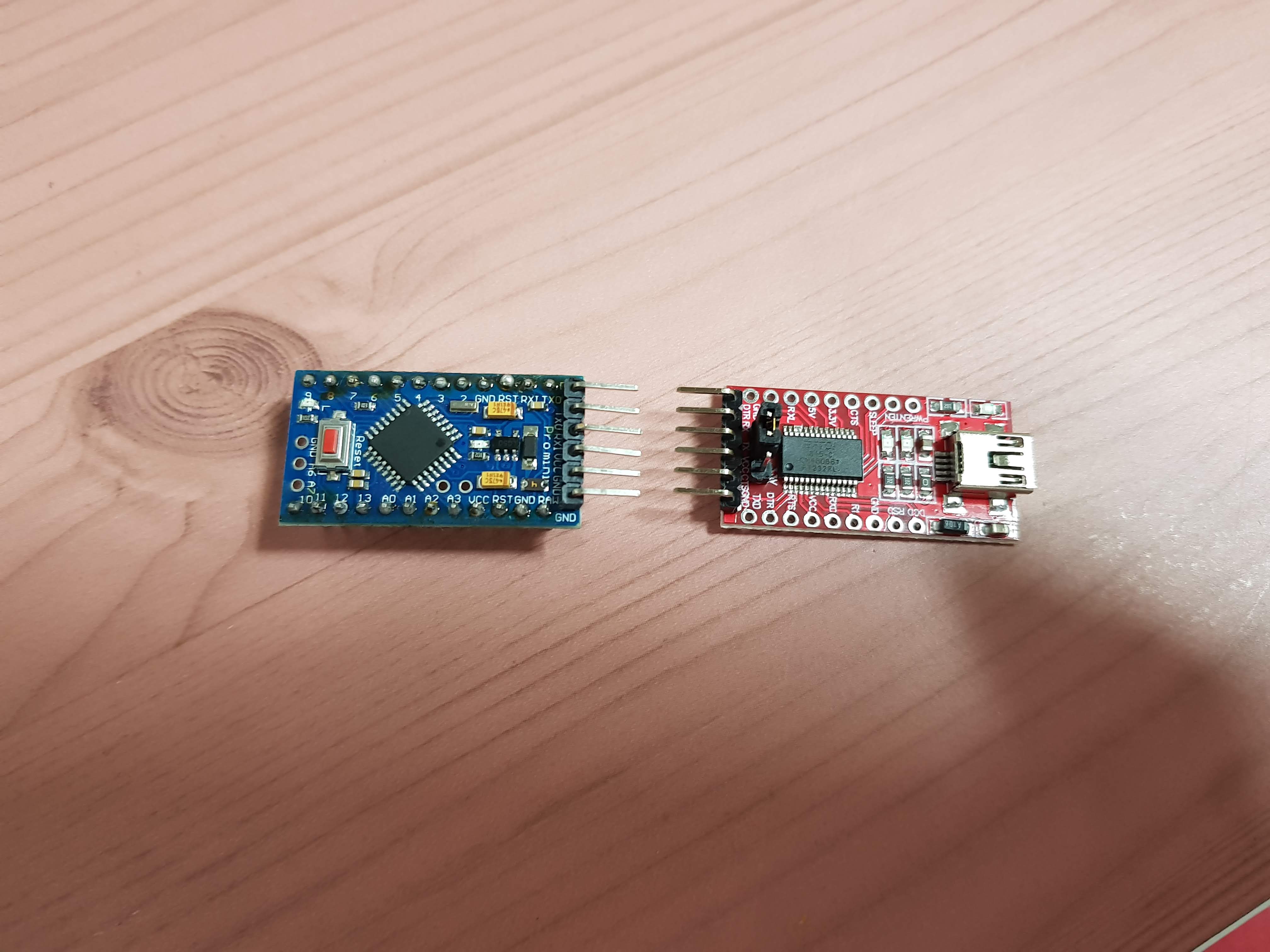 아두이노 프로의 외형을 보면, 기존의 아두이노와 크게 다른 점이 눈에 보일 것이다. 바로 USB 단자가 없다는 것이다. 기존의 아두이노는 PC랑 Serial통신을 이용해 프로그램을 업로드하고 소통을 한다. 하지만 이것은 UART 변환보드 또는 FTDI 변환 보드가 필요하다. 나는 FTDI 보드를 이용해 업로드했다.