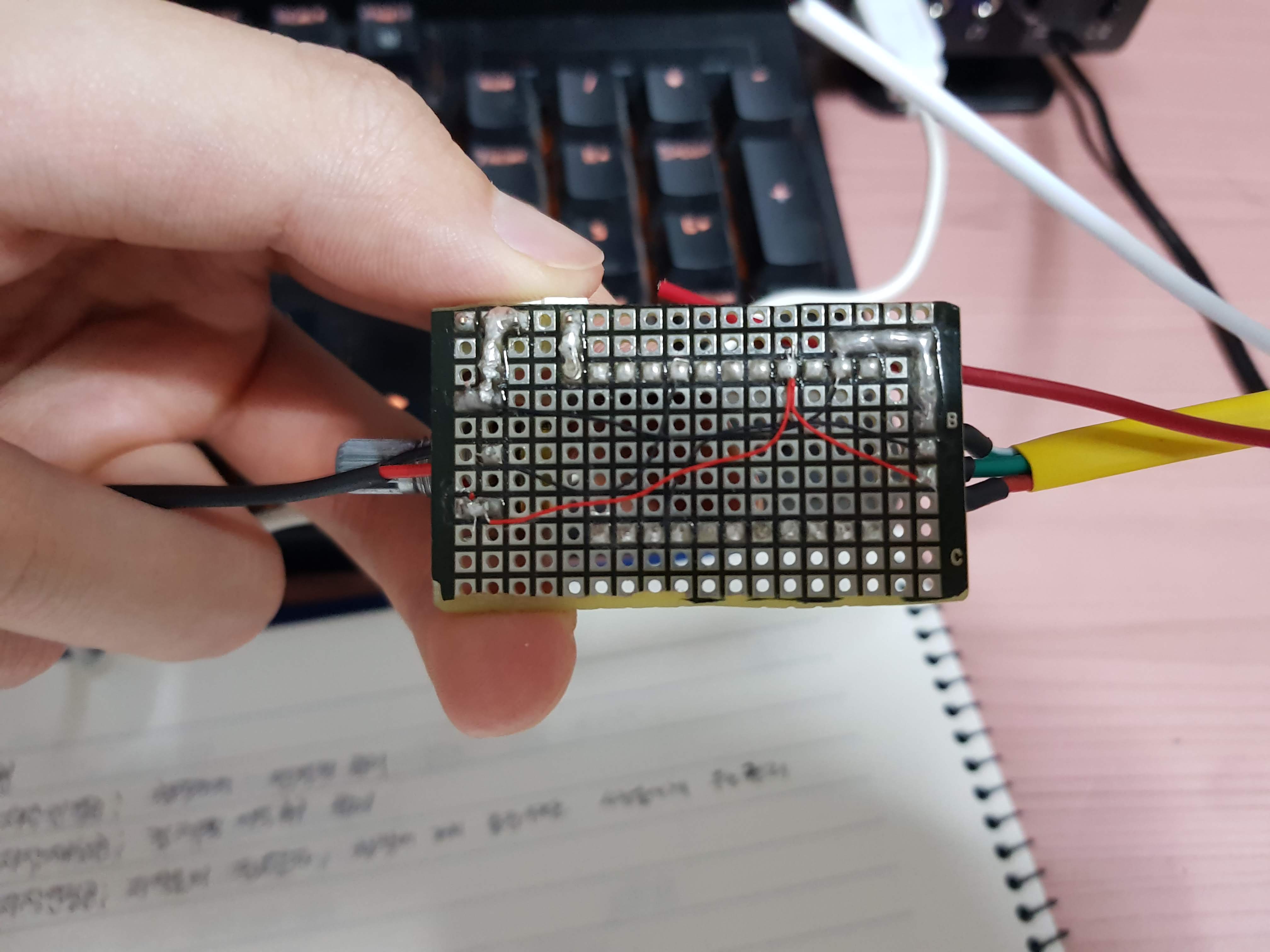 후면도 회로도에 따라 납땜을 해 준다. 전류가 과하게 들어갈까봐 전선을 두꺼운 것으로 할려했으나, 얇은 선밖에 없어서 어쩔 수 없이 그것들로 납땜을 했다.
