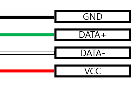 대부분 저렇게 4개의 선이 나올 것이다. USB 2.0은 총 4개의 선을 이용해 데이터 전송을 한다. 3.0 부터는 기존 4개 + 4개의 추가 데이터 전송선 해서 대부분 8개의 배선이 있을 것이다. 꼽는 단자는 4개 + 5개 해서 총 9개가 있다. 여튼 검은색, 녹색, 흰색, 빨간색 4개의 색이 나오는데, 대부분 검은선과 빨간선이 전원을 위한 선이다. 가장 정확한 방법은 멀티미터로 확인하는 것인데, 특수한 경우가 아니면 저 두가지의 색상이 전원일 것이다.