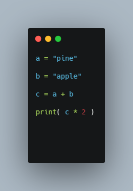 위 코드의 실행 결과는 pineapplepineapple 이다. 문자열 곱하기는 실제 곱한다는 개념보다는, 2를 곱했을 경우에는 2번 반복해서 출력한다는 느낌을 준다.
