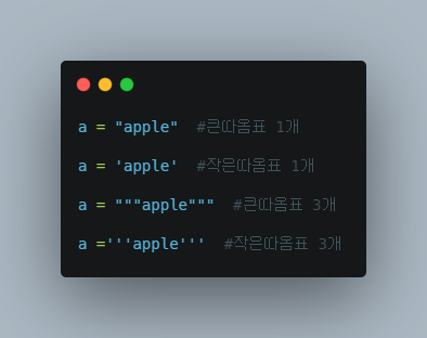 위에서는 apple 이라는 문자열을 a라는 변수에 대입한 것이다. 문자열은 4가지 방식으로 선언이 가능하다. 위에서 선언한 형태는 모두 똑같다. 문자열을 선언하는 것은 모두 같은데, 방법은 모두 다르다. 그 이유는 무엇일까? 문자열의 표현 차이다. 예를 들어 문자열 안에 큰따옴표나 작은따옴표를 넣고 싶을 경우가 있을 것이다. 그러할 때 이러한 기능을 사용한다.
