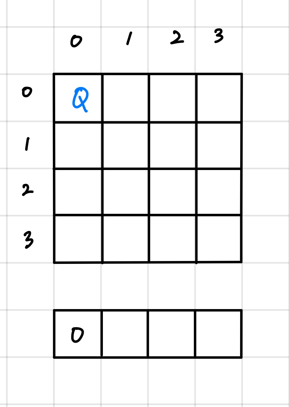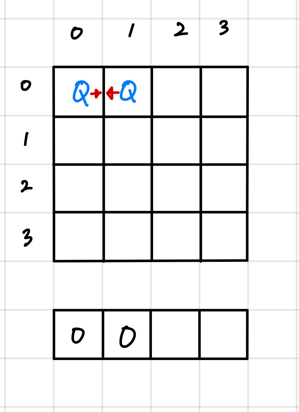 이 경우에서는 어떠한 충돌도 일어나지 않는다. 이렇게 배치했을 때 정답이 나올 수도 있다. (라고 가정한다. 하지만 실제로는 (0,0)에 퀸을 배치해서는 안된다.)