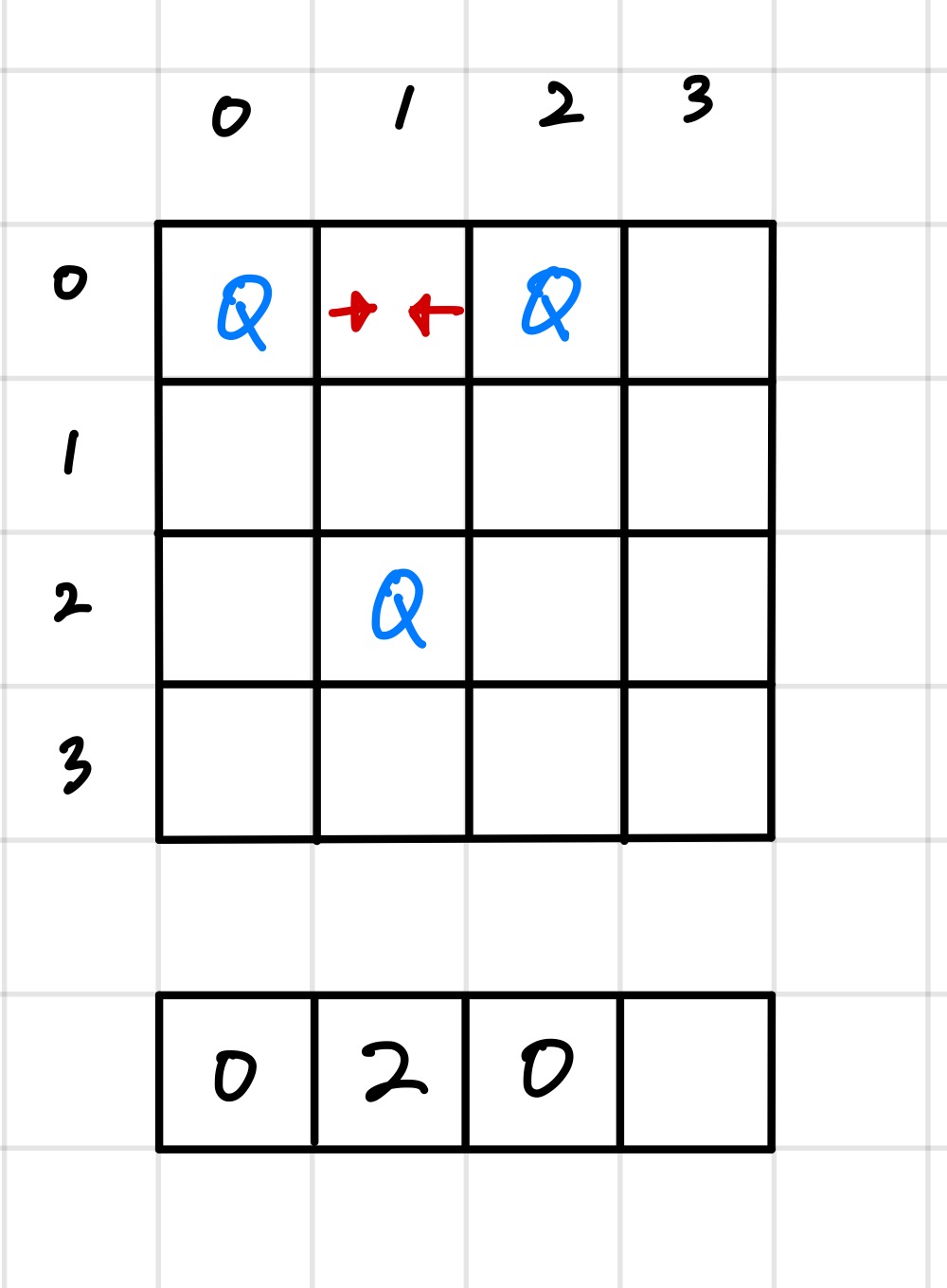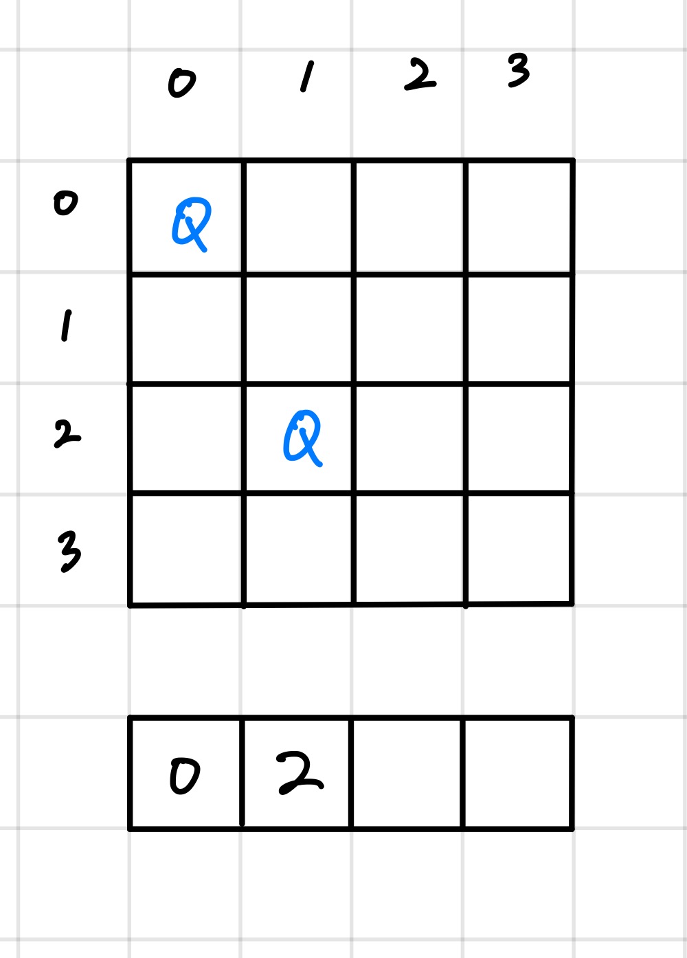 다음 칸으로 넘어가서 (0,2)에 퀸을 배치한다. 하지만 (0,0) 퀸을 공격할 수 있으므로, 다음 경우로 넘어간다.