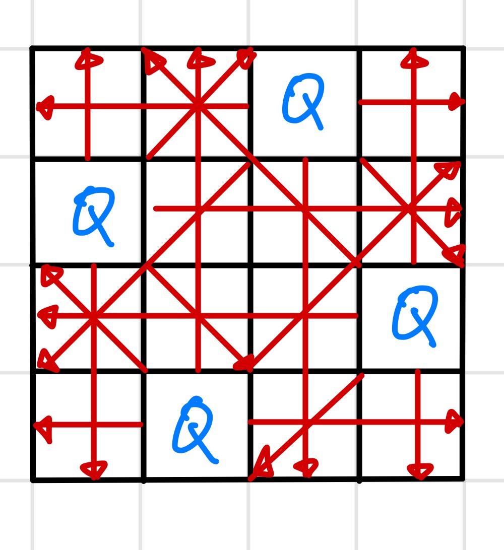 이러한 생각으로 문제를 다시 풀어보자. 나는 체스를 모르기 때문에, 퀸이 공격할 수 있는 경우부터 알아보자. 퀸은 가로 세로 대각선 모든 직선으로 공격이 가능하다.