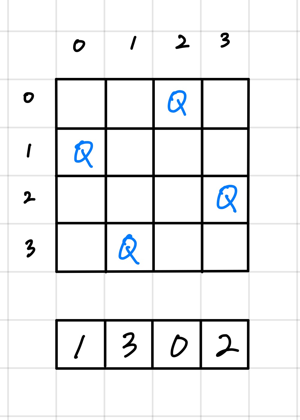 목표를 알았으니, 백트래킹에 대해서도 알아보자. 앞서 말했듯이, 백트래킹은 "가능성이 있는 경우만 탐색" 하는 알고리즘이다. 4x4 체스판에 대해서 예를 들어보자. 위에 있는 체스판이 존재한다고 가정하자. 실제 계산은 그림의 아래에 있는 1차원 배열에 값을 넣으면서 진행할 것이다.