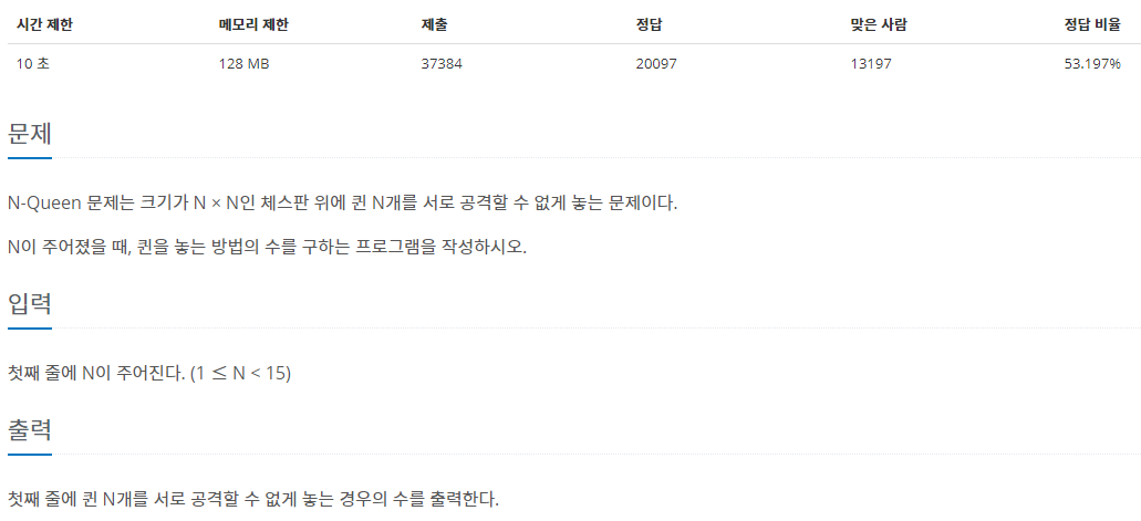 알고리즘 문제 중에서는 매우 유명한 N-Queen 문제다. 문제는 다음과 같다.