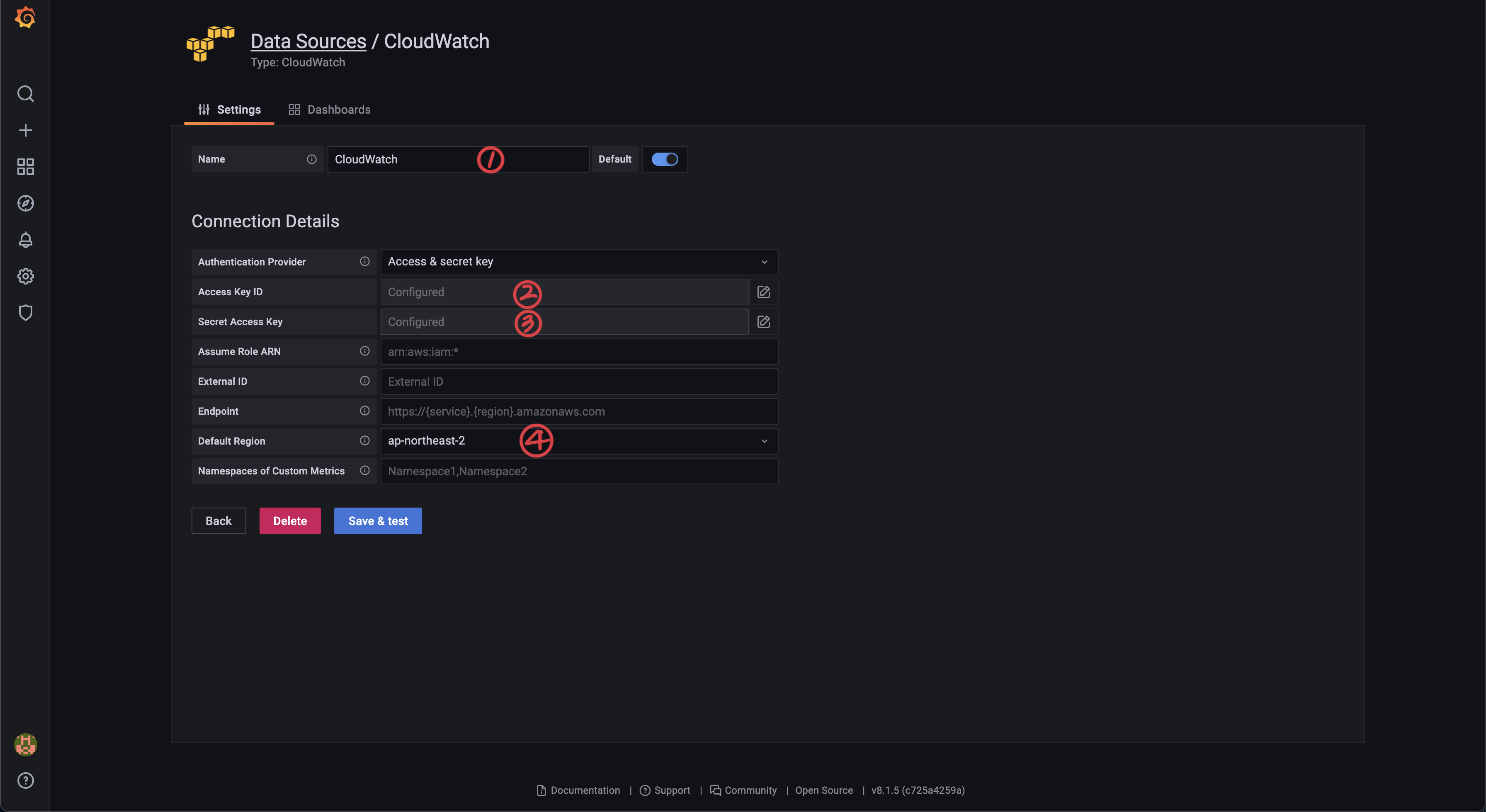 그 다음에는 이러한 화면이 나오게 된다. 1번은 CloudWatch, 2번은 IAM 자격증명의 아이디, 3번은 시크릿 키를 입력한다. 4번에는 계정의 현재 리전을 입력한다. 그리고 Save를 누르면 연동이 될 것이다.
