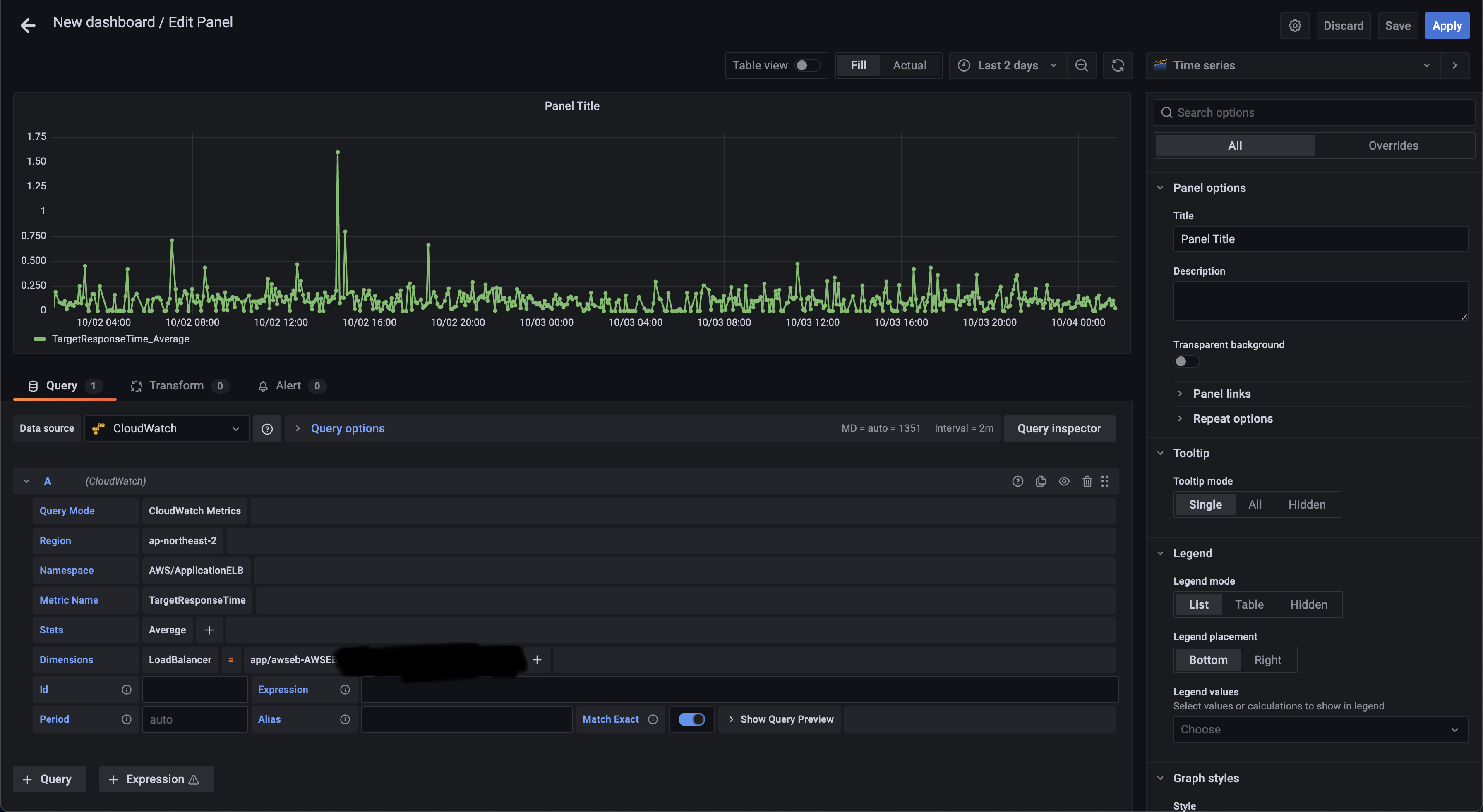 Data Source를 CloudWatch로 설정 후 IAM Access Key와 Secreat Key를 추가 후 인증을 하면 된다. 이 때 IAM 권한에 CloudWatchFullAccess 권한을 추가해야 정상적으로 데이터가 보이게 된다. 그 이후에는 보고 싶은 데이터를 추가해서 보면 된다. 추가 이후 우측의 그래프 설정을 해야지 그래프가 보이는 것 같았다. 나의 경우에는 로드밸런서 응답 시간을 보여주었다. 이대로 추가하면 AWS의 데이터를 쉽게 그래프로 표현할 수 있다.