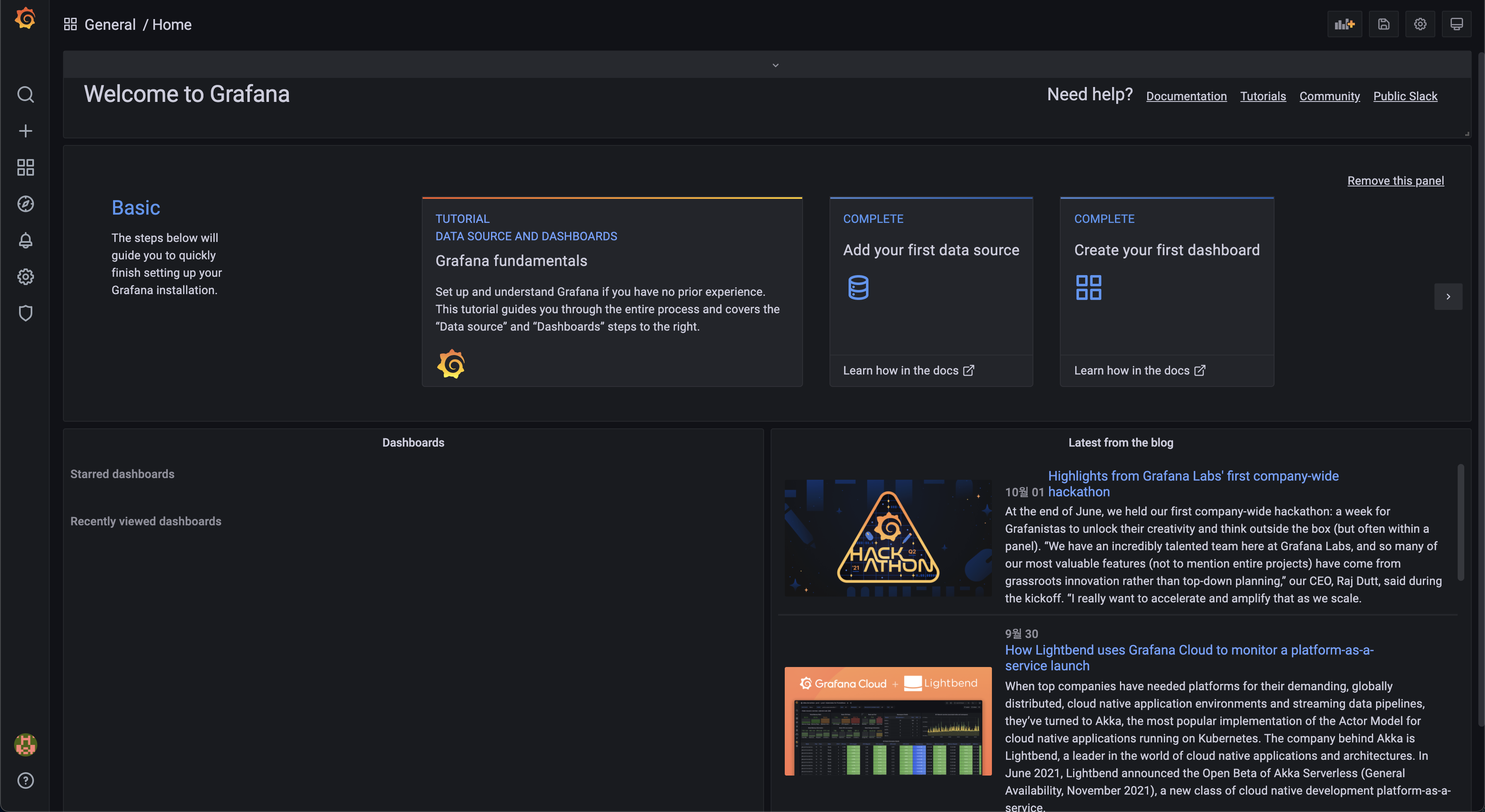 일단은 그라파나를 실행하면 아래와 같은 화면이 나오게 된다. 여기서 AWS랑 연결해 보자.