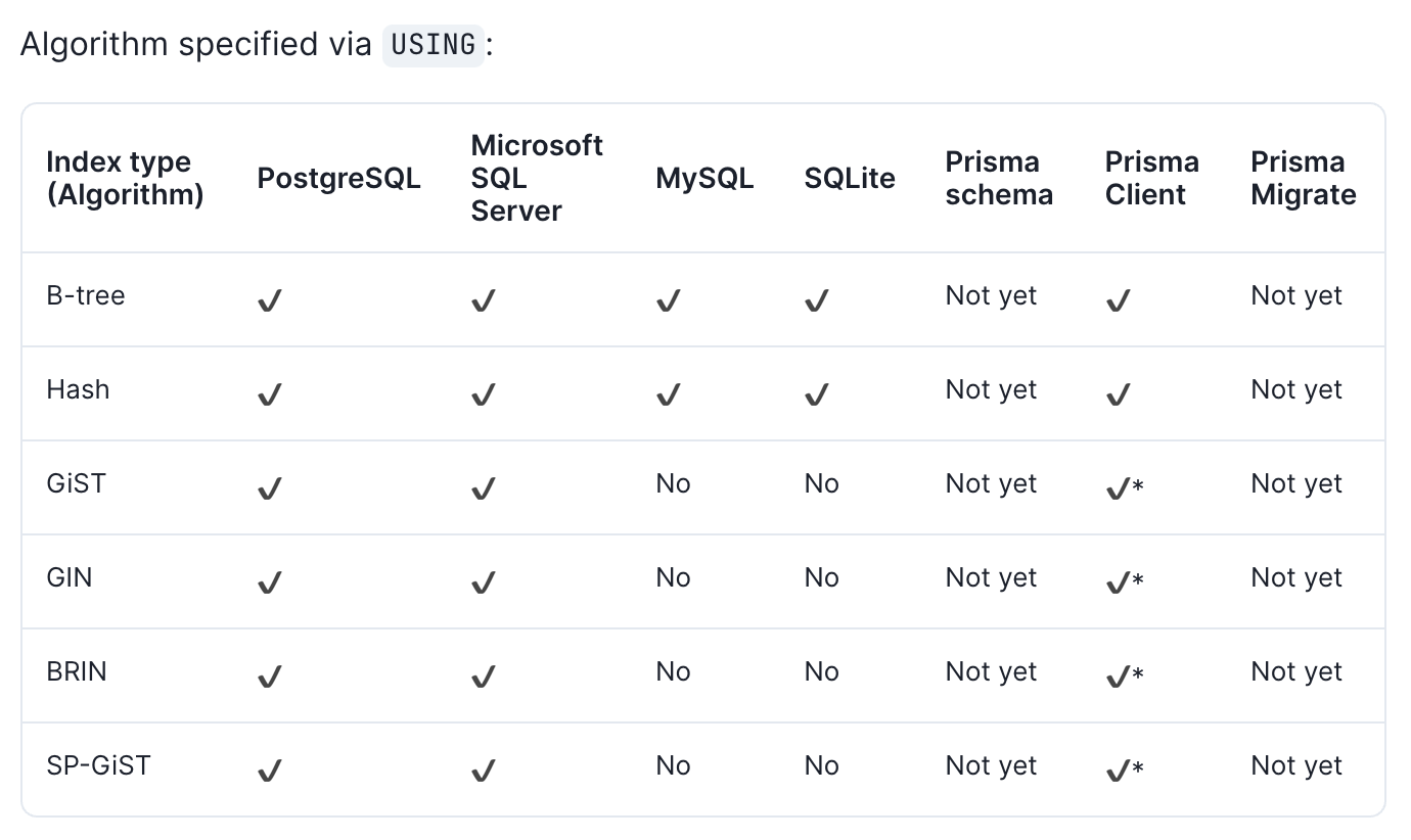 그래서 brin 알고리즘을 사용할까 싶기도 했다. 하지만 여기서도 문제가 생겼다. 우리의 서버는 현재 ORM으로 prisma schema를 사용중이다. brin 알고리즘이 prisma schema와 호환되는지 확인하러 가 보았다.