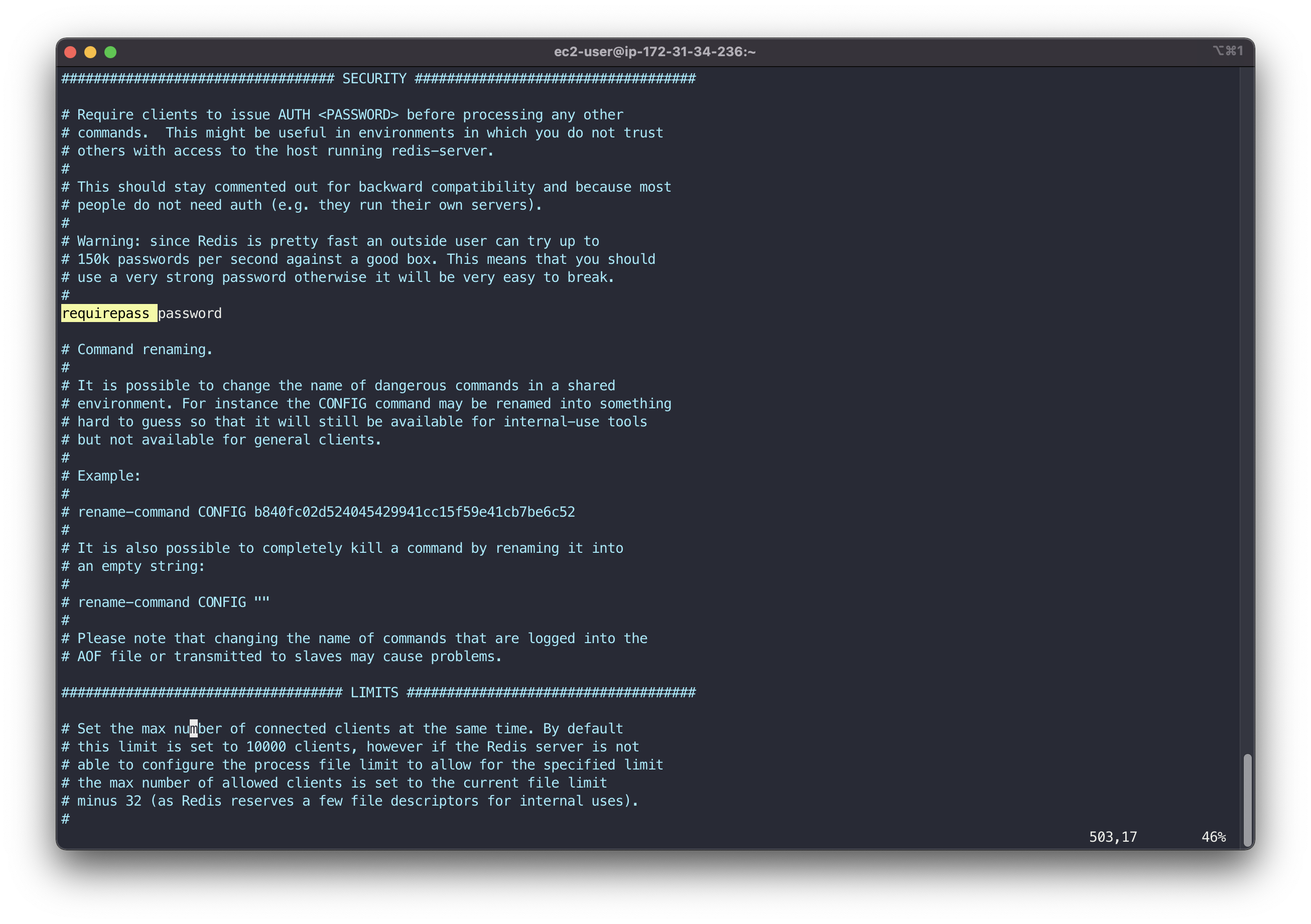 여기다가 간단한 인증 시스템을 추가하자. redis 설정 파일을 직접 수정하고 재시동 하면 된다. 파일은 /etc/redis.conf 에 있다. 인증 방법은 redis-cli에서 auth를 입력 후에 암호를 입력하게 되면 접속 권한이 주어지게 된다. (명령어 : auth [암호]) vim으로 redis.conf 파일을 수정하자. redis.conf 파일 안에 requirepass 값 다음에 암호를 입력하면 된다.
