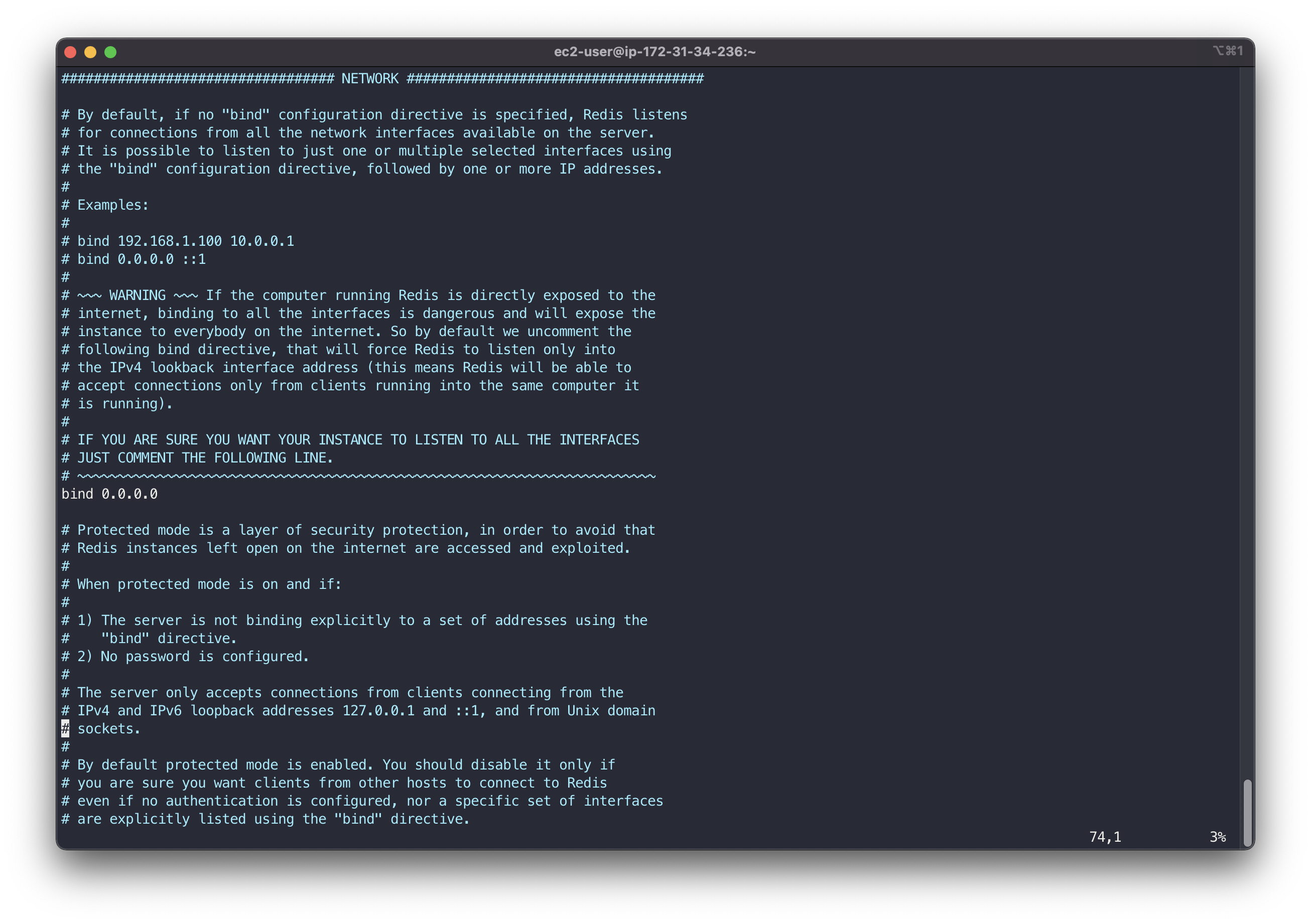 다음으로는 외부 접속을 허용해주자. redis의 기본값은 localhost만 접속이 가능하게 되어있다. 이거를 해제해 주어야지 외부에서 캐시 접속이 가능해진다. 설정 파일에서 bind라는 항목을 찾아서 수정한다. 값을 0.0.0.0 으로 설정하면 모든외부 접속을 가능하게 한다.