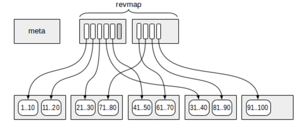 이것은 특정한 범위에 따라서 데이터를 묶어 두고, 거기서 다시 찾아가는 방식이다. 이 방식에 특화되어 있는 db는 시간에 따라서 정렬해야 하는 데이터이다. 시간의 범위에 따라서 검색, 탐색 및 수정을 하는 작업에는 이 알고리즘이 좋다. 저장되는 방식을 도식화하면 아래와 같은 그림이 나오게 된다.