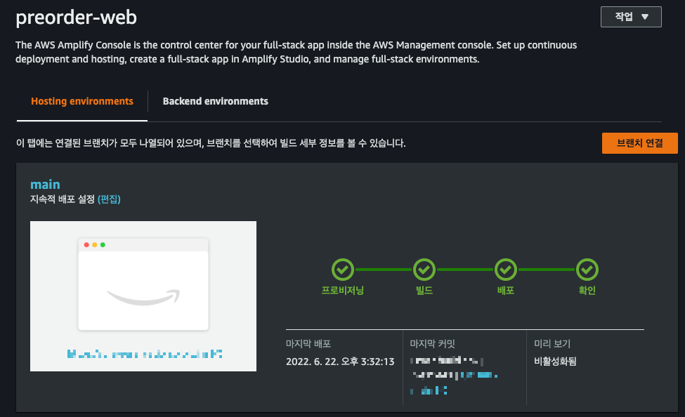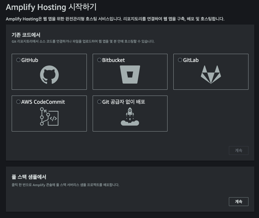 배포도 너무 간단하다. 일단 Amplify 콘솔에 들어간 후 웹 앱 호스팅을 누른다. 이후에 github에 올린 코드를 불러온다.