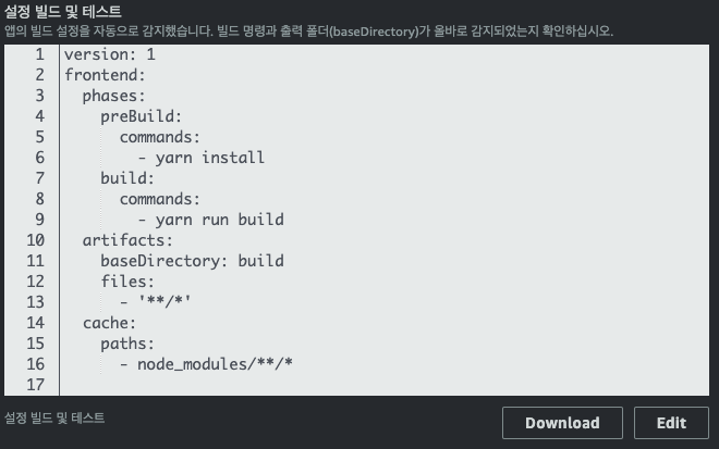 이후에는 yml파일을 확인하자. react app을 실행할 때를 생각하면 된다. yarn install로 패키지들을 다운받고 (npm ci가 조금 더 낫다.) build 이후, build된 파일을 호스팅하는 방식이다. yml에 들어갈 내용은 다음 페이지에 상세히 나와있다.