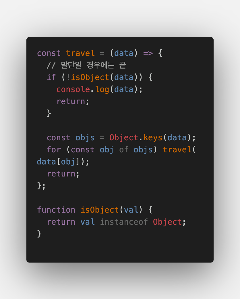 TS를 사용하면서 Object에 대해서 전체 순회를 해야 할 일이 생겼다. Object 안의 Object도 모두 순회할 일이 있다 보니, 한번 만들어 두면 나중에도 요긴하게 쓰일 것 같았다.