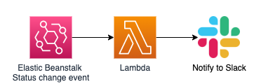 구조는 간단하다. Elastic Beanstalk은 상태 변화와 관련된 이벤트를 EventBridge로 보내주게 된다. 이 이벤트를 잡아서 슬랙으로 이벤트 정보를 보내 주면 될 것 같았다. 이벤트 하나 보내주자고 ec2 서버를 여는 것은 문제가 있어 보여서, Lambda를 이용해서 메시지를 보내는 것이 좋을 것 같았다.