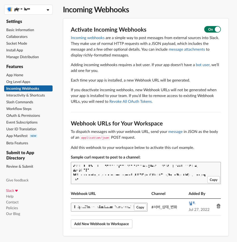 이후에는 Features - incomming Webhoos에서 toggle을 킨 다음, 하단의 Webhook을 특정 채널과 연결해준다. 그러면 다음과 같이 Webhook URL이 생긴다.