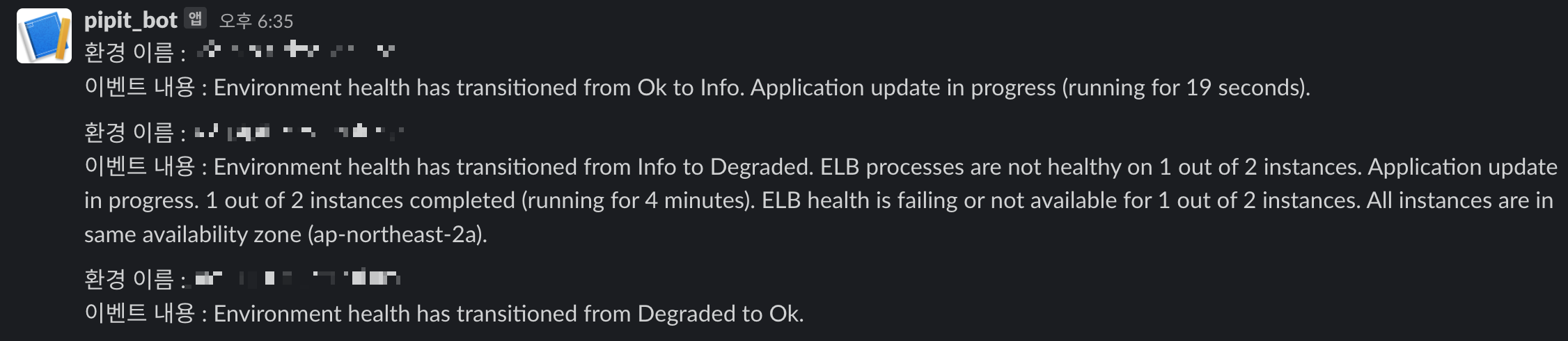 현재 운영중인 서버는 Elastic Beanstalk으로 관리를 하고 있다. 덕분에 오토 스케일링, 블루그린 배포 등등 서버와 관련된 설정들을 간편하게 관리하는 중이다. 명령어 몇 줄이면 자동으로 배포가 가능한 편리한 기능이다. 최근에 서버 운영 중 서버가 죽는 일이 있었다. 이 때 서버 운영 문제를 바로 알았더라면 대응이 조금 더 빨리 되었을 것 같은데, 바로 알아차리지 못해서 대처가 조금 늦었다. 그래서 서버에 문제가 생기거나 상태 변화가 있을 때 바로 슬랙으로 서버 상태를 보내주는 로직이 필요할 것 같아서, 바로 서비스를 구축해보기로 했다.