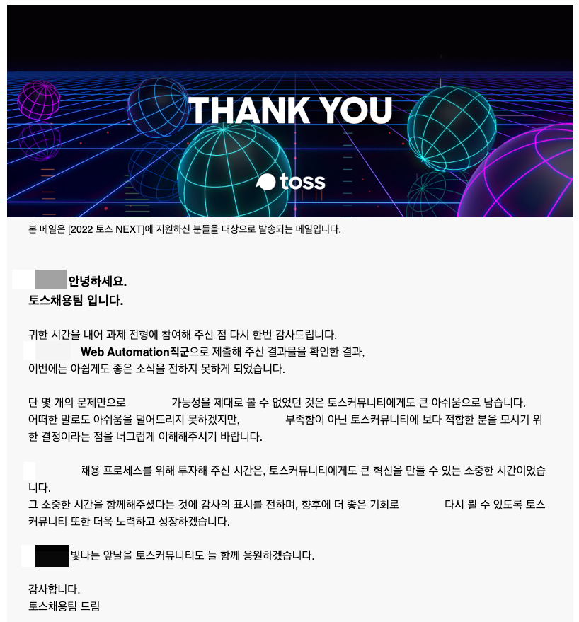 이번에 친구의 추천으로 토스 next 코딩테스트를 보게 되었다. 사실 그냥 내 실력 테스트 느낌으로 한번 보는 거라서, 부담은 딱히 없었다. 서버 부분은 기술 스택이 달라서 Web Automation 분야로 코딩 테스트를 신청했다.
