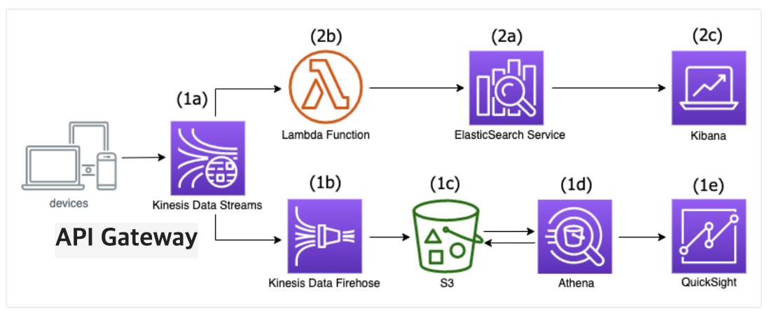 기본 플로우는 아래의 BI System 도큐먼트를 참고했고, 여기서 클라이언트에서 Kinesis로 바로 접속할 수 있도록 APi Gateway를 연결해 주려고 한다. 그리고 Elastic Search로 데이터를 업로드 하는 로직은 나중에 만들 예정이다. 아직 우리의 환경에서는 이벤트를 Elastic Search 같은 서치 엔진 까지는 도입할 필요가 없다고 생각이 되기 때문이다.