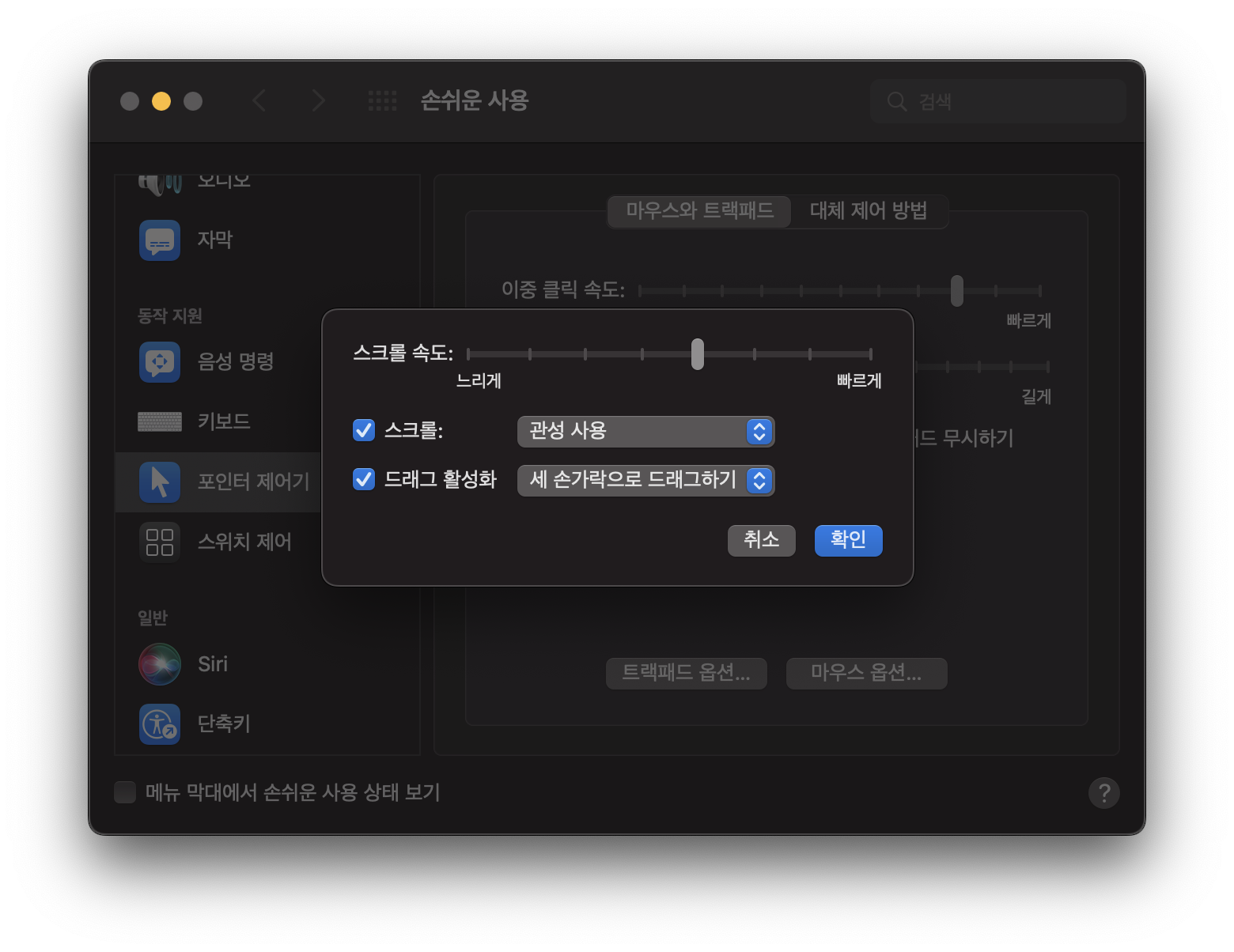 미션 컨트롤은 네 손가락으로 쓸어올리기, 세 손가락은 드래그로 사용하고 있다. 세 손가락 드래그는 손쉬운 사용 - 포인터 제어기 - 마우스와 트랙패드 - 드래그 활성화 - 세 손가락으로 드래그하기를 클릭하면 된다.