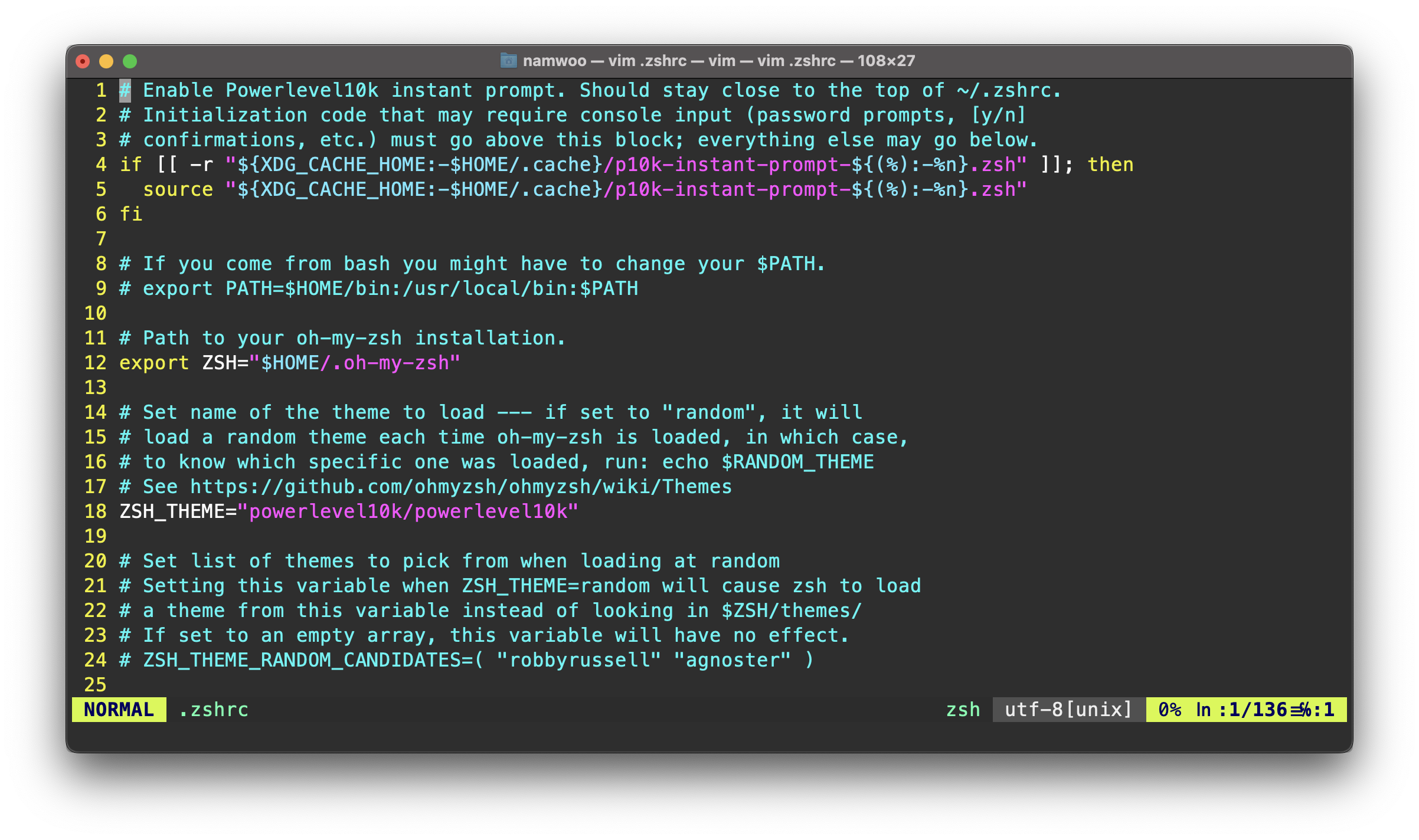 사실 터미널 환경은 진짜 별 거 없다. 국룰 패키지 관리자 homebrew와 터미널 커스텀을 위한 powerlevel10k, 마지막으로 vim을 약간 커스텀했다. iTerm이라는 터미널 프로그램도 있지만, React Native 디버거와 충돌하는 이슈가 있어서 그냥 기본 터미널을 쓴다.