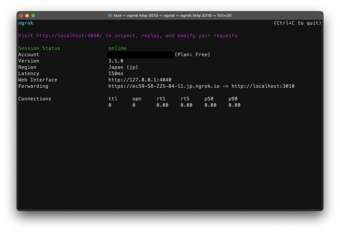 이후에는 외부로 노출한 주소가 표시된다. 해당 주소는 Free plan 기준으로 1회 8시간, 실행할 때마다 랜덤하게 주소가 바뀌게 된다. 회원가입 이후 auth 토큰을 입력한 경우에는 시간제한이 증가하는 것으로 알고 있다.