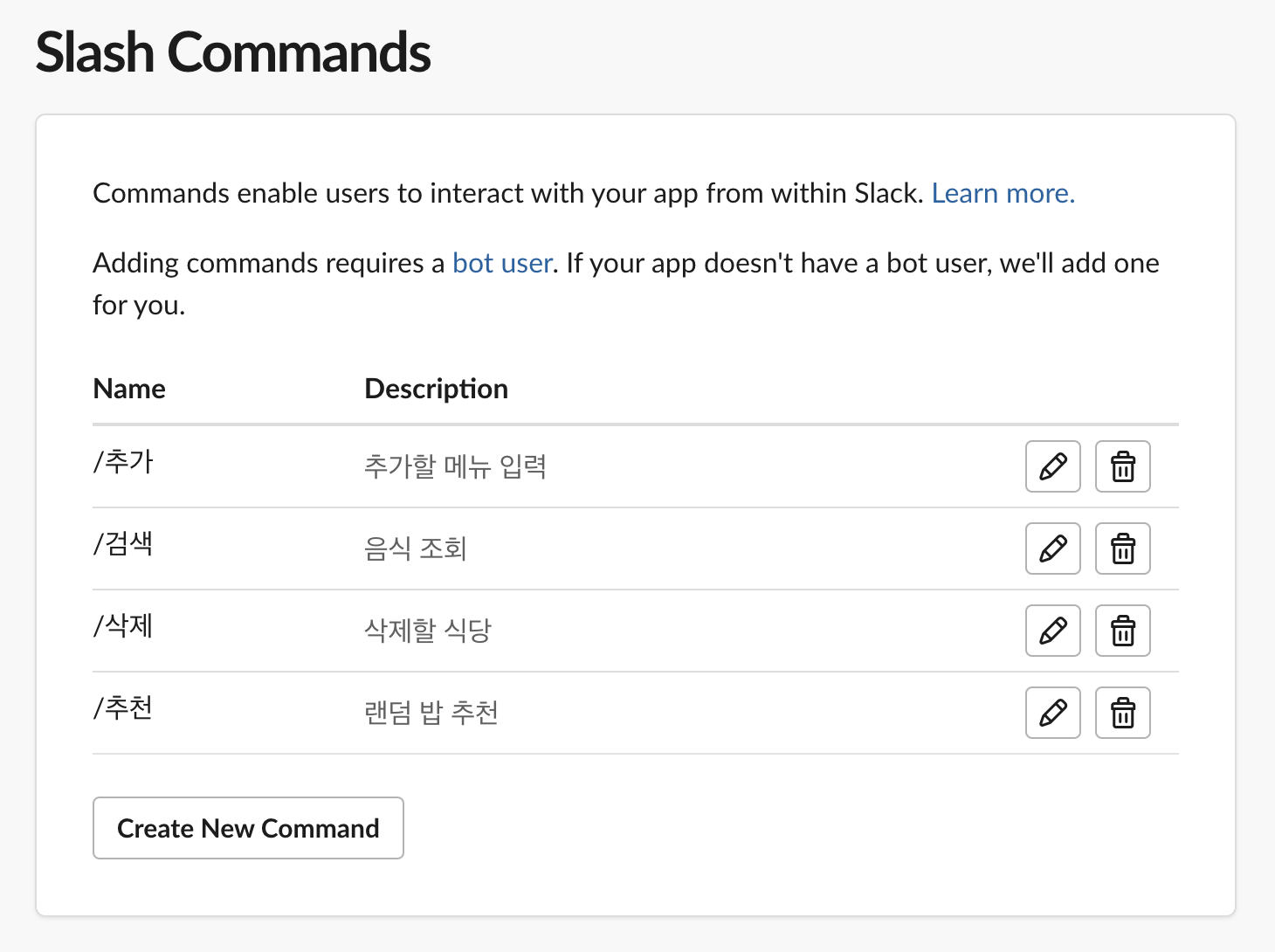생성된 앱의 설정에서 Slash Commands 메뉴를 선택한다. 이후 원하는 커맨드와 API 주소를 매칭하여 추가한다. 자세한 내용은 글의 하단에 있는 공식 문서에 자세히 나와 있다.
