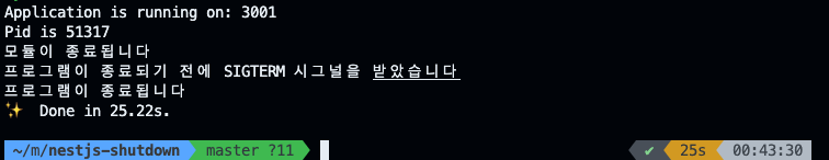 해당 메서드를 구현한 이후 IDLE 상태의 애플리케이션에 SIGTERM 신호를 주게되면, 애플리케이션이 onModuleDestory -> beforeAplicationShutdown-> onApplicationShutdown 순서대로 실행되는 것을 볼 수 있다.