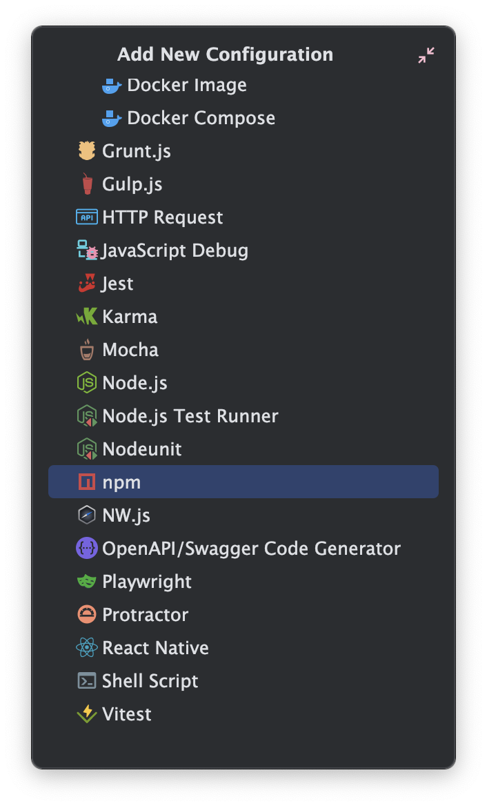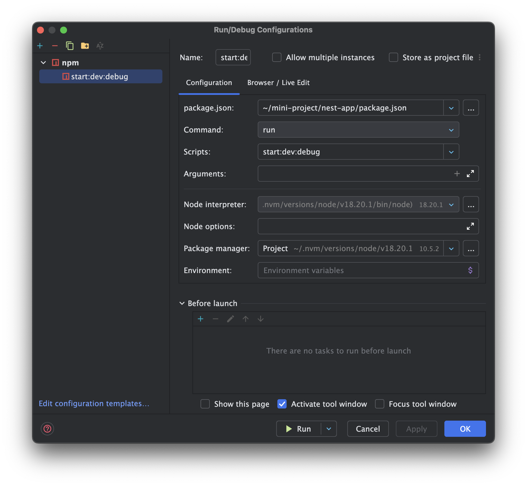 옵션의 설정을 아래와 같이 한다. 이렇게 해두면 앞에서 설정한 package.json에 있는 스크립트 실행이 가능해진다.