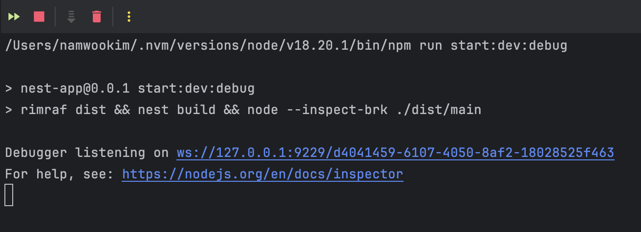 해당 스크립트는 기존 build결과물 제어 후 nest를 빌드하고, 빌드된 파일을 --inspect-brk 옵션을 통해서 실행을 한다.