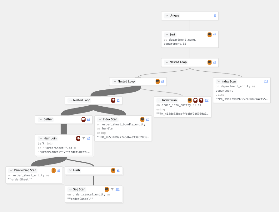 기존 쿼리를 요약해 보았다. 해당 쿼리를 확인해 보면 특이한 점이 보인다. 전체 where 절에서 orderCancel의 수를 count하여 0인지 판별하는 로직이 들어가있다. 해당 로직이 문제가 되는 것이 inner join된 데이터에서 where로 데이터를 필터링할 때 마다 해당 쿼리가 실행되게 된다. 즉, 말도 안되게 많은 연산이 실행되는 것이다. 해당 쿼리를 explain anayse 해서 실행 계획을 보면 첫번째 줄은 다음과 같이 보인다.